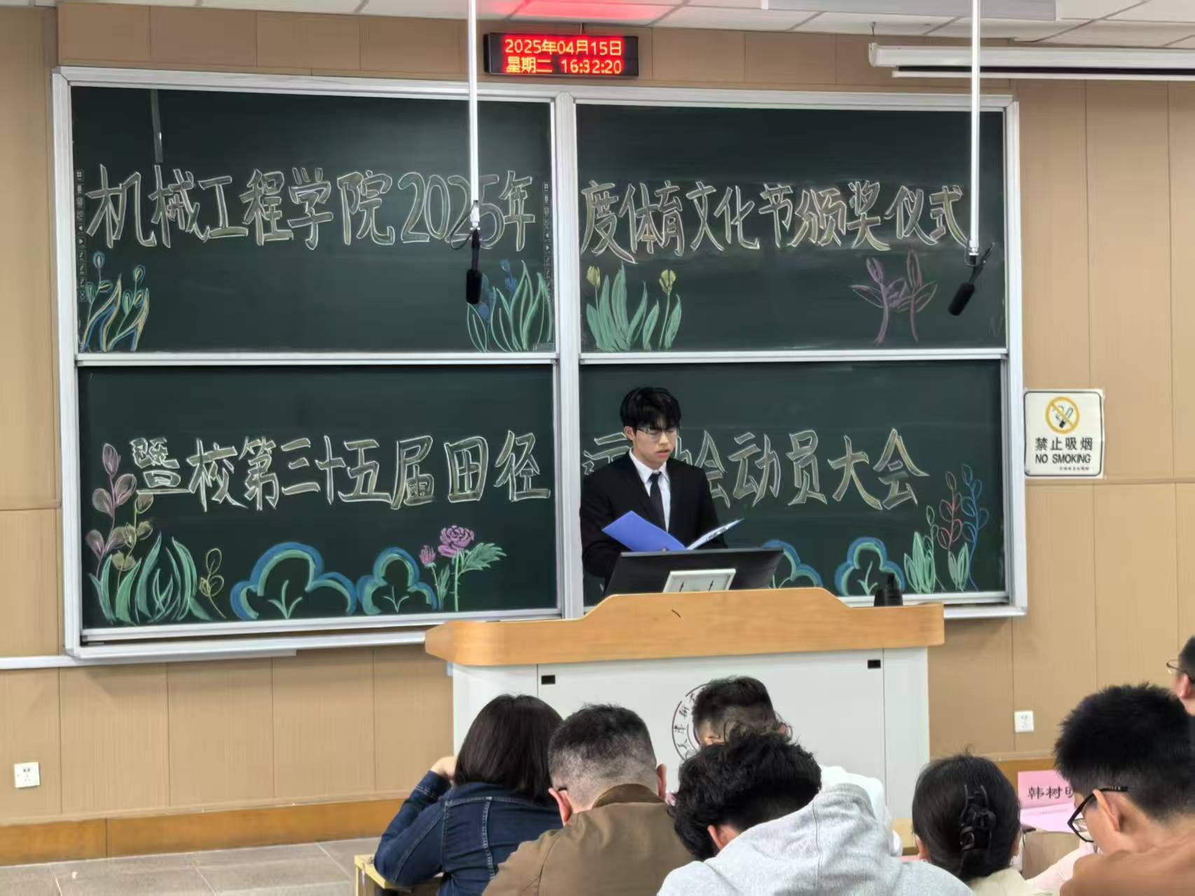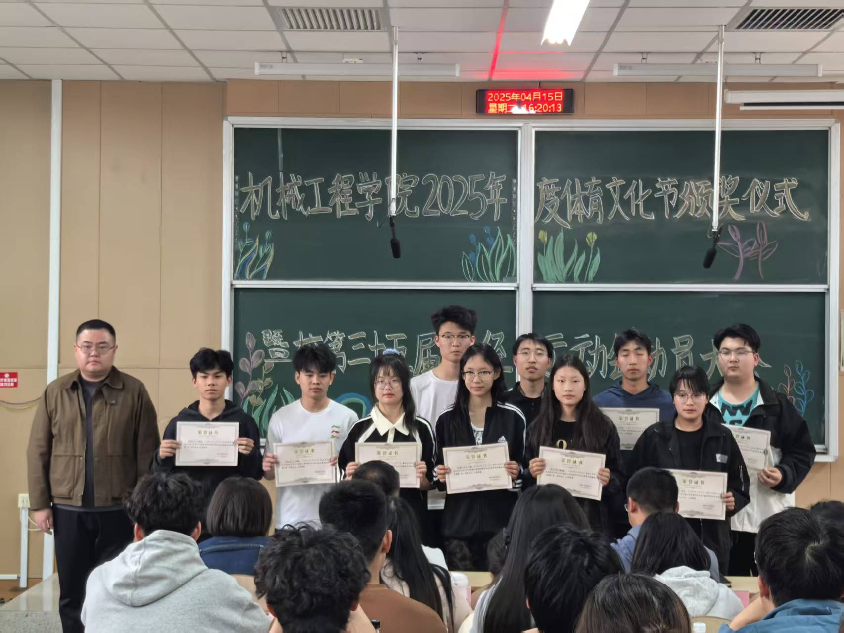 预会教员为教院拔河角逐获奖的9个班级代替战教院田径活动会获奖的103实活动员顺次发表获奖文凭。